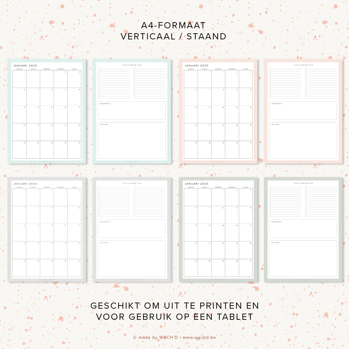 ▶ Eén kalender voor elke maand van 2025 in 11 kleuren: Beige, Clean, Blauw, Geel, Grijs, Groen, Mint, Oranje, Paars, Roze en Zwart.