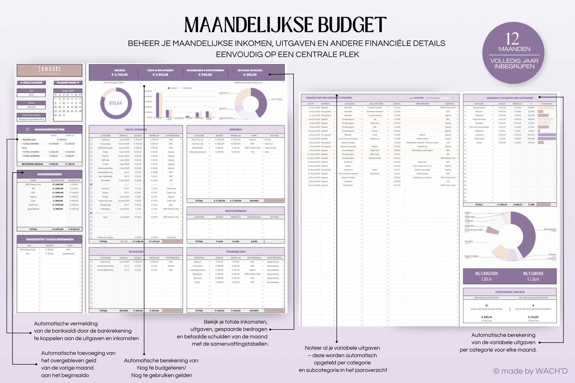 Maandelijkse Overzichten: Houd je financiën maandelijks bij met 12 tabbladen – één voor elke maand. Vul hier al je kosten en inkomsten in, en volg je uitgaven nauwkeurig.