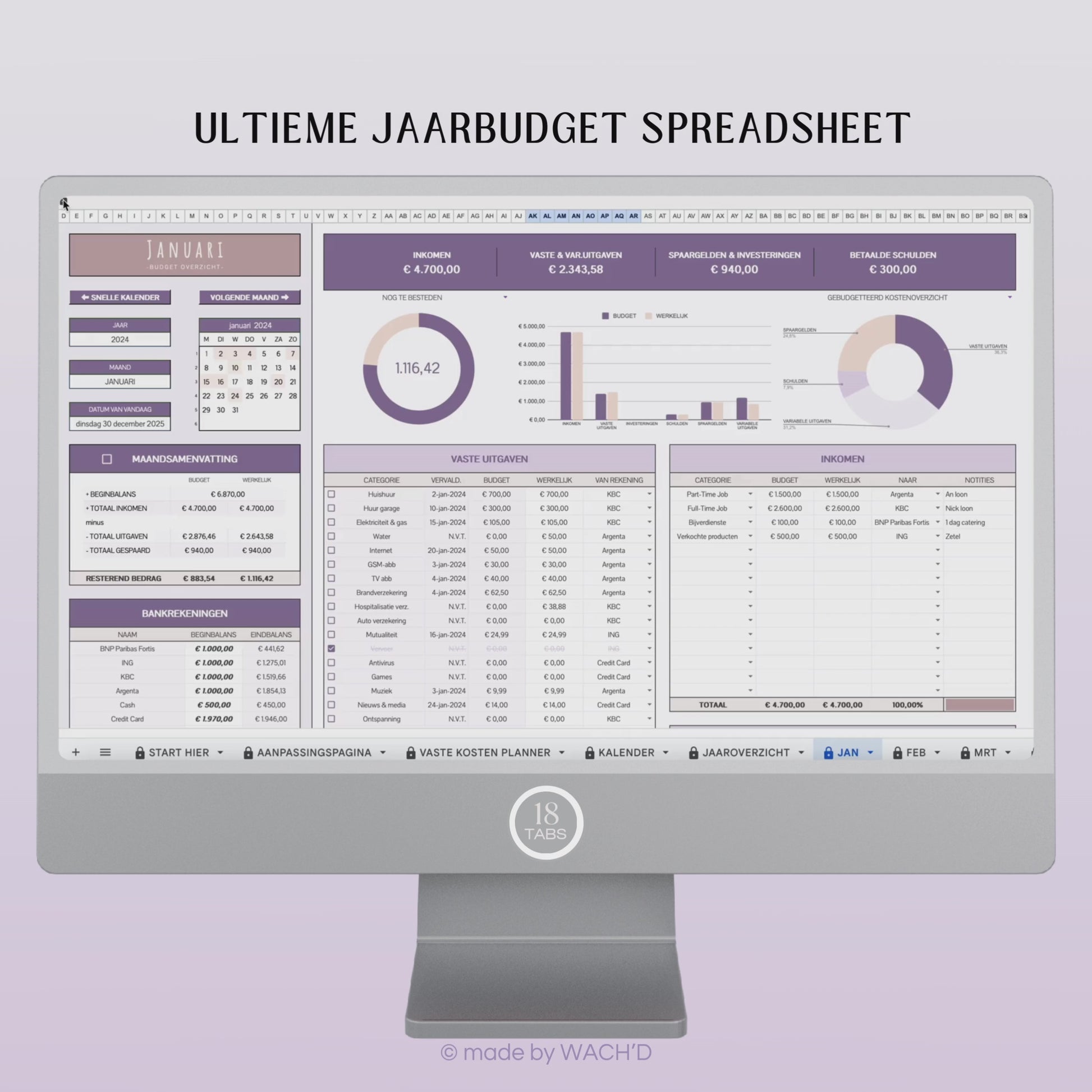 Wil je je financiële situatie eenvoudig en effectief beheren? Onze Personal Budget Spreadsheet is de perfecte tool voor jou! Deze uitgebreide en gebruiksvriendelijke spreadsheet bevat maar liefst 18 tabbladen om je te helpen je financiën het hele jaar door op orde te houden.