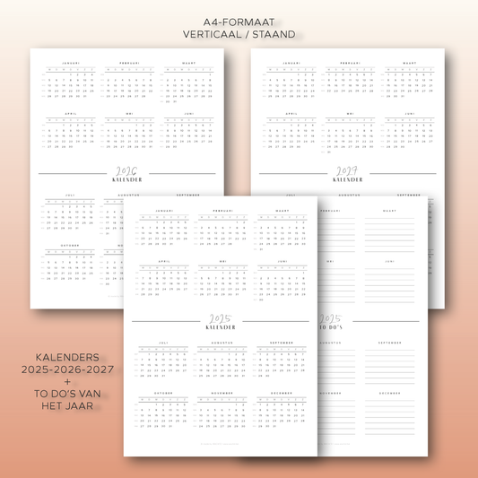 Jaarkalenders 2025 & 2026 & 2027 | A4 printbare pdf